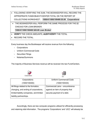 The document provides instructions for Indiana bookkeepers on preparing daily deposits of revenue. It states that all revenue must be deposited by the following business day. The bookkeeper is responsible for auditing revenue from various departments, preparing deposit paperwork, and taking the daily deposit to the Treasurer's Office for verification and deposit. Revenues are processed and recorded according to the fund, object, and center codes to which they apply.