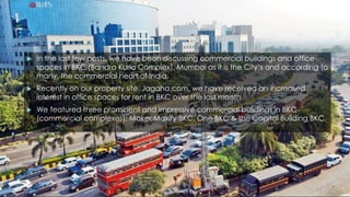 The document discusses the rising interest in commercial office spaces for rent in BKC (Bandra Kurla Complex), Mumbai, highlighting its importance as a commercial hub in India. It features three notable buildings: Maker Maxity BKC, One BKC, and The Capital Building BKC, while also suggesting additional properties like Parinee Crescenzo, Platina Building, and Godrej BKC for consideration. The document encourages inquiries for those seeking quality office space or property in the area.