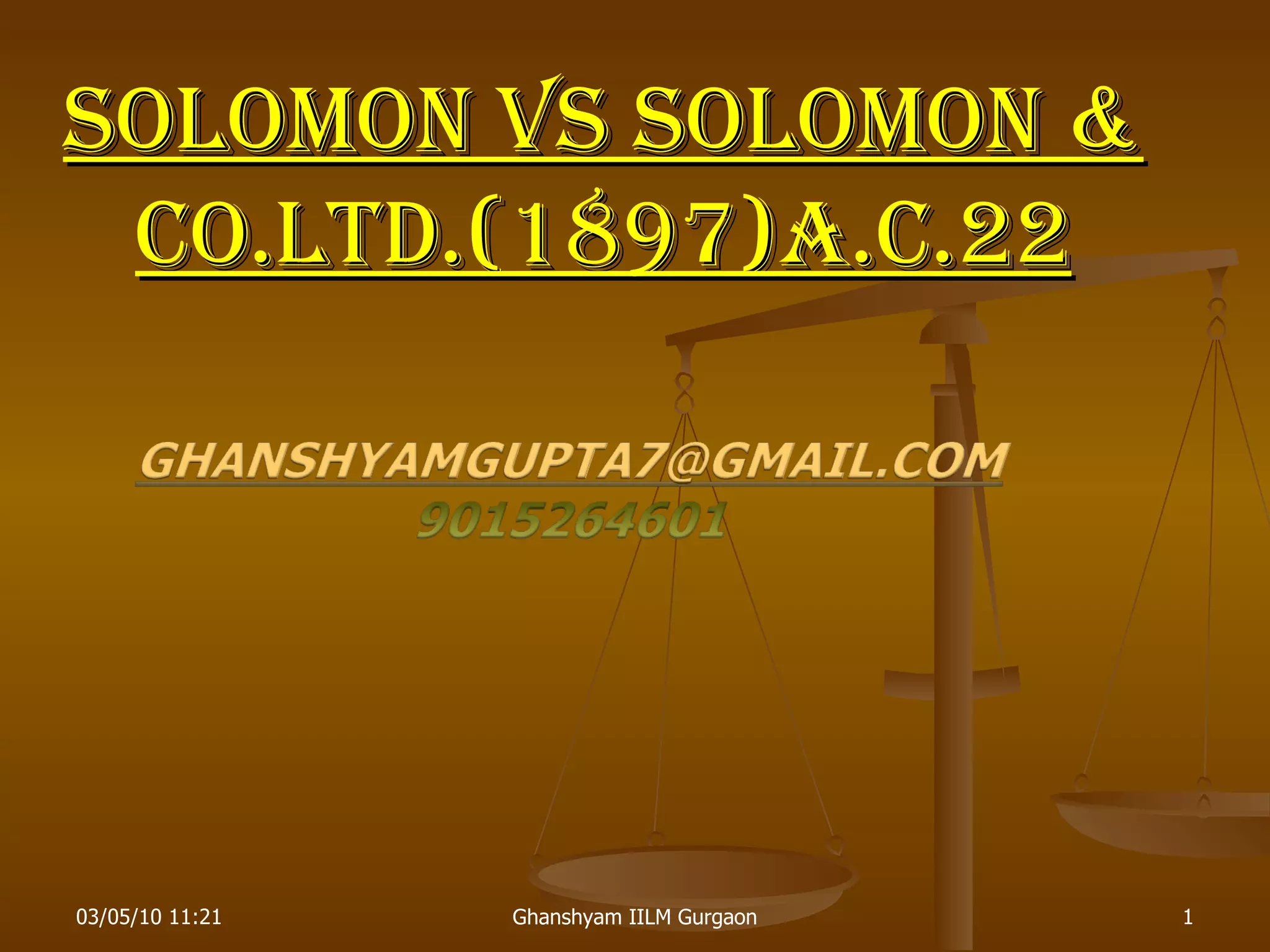 Mr. Aron Salomon converted his boot and shoe manufacturing business into a limited company. He owned 20,001 of the company's 20,007 shares while family members each held one share. When the company went into liquidation due to financial difficulties, creditors argued the company was a sham. However, the House of Lords upheld the separate legal identity of the company, finding no evidence of fraud, and ruled that creditors could only seek repayment from the company's assets, not Mr. Salomon personally. This established that a company is a separate legal entity from its shareholders.