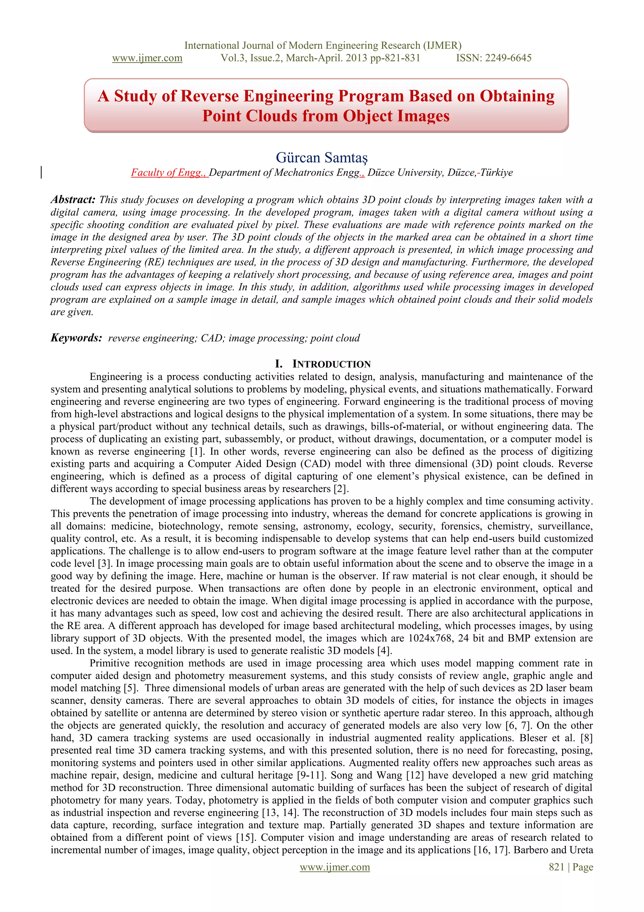 The document describes a study that develops a program to obtain 3D point clouds from digital images without requiring specialized camera setup. The program analyzes images pixel-by-pixel within a user-defined area of interest. Reference points in the image area allow processing a limited region, reducing computation time. The program uses color values and edge detection to identify object pixels and represent them as point clouds. Sample images and their converted 3D models demonstrate the technique.