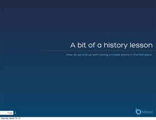 The document provides an overview of the mobile industry, including its history from large, heavy, slow phones only for calls and SMS to the app revolution. It discusses mobile operating systems, different types of mobile phones, statistics on mobile phone and app users in Indonesia, and job opportunities in the growing mobile app developer field. It encourages building your own mobile applications to make money and help solve problems.