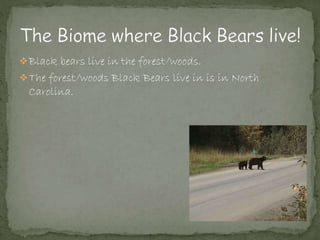 Black bears live in the forests of North Carolina, where they eat yellow jackets, meat, and other foods as omnivores. They survive by protecting themselves from predators, hibernate in winter, and vary widely in weight from 300 pounds for females to over 800 pounds for some males.