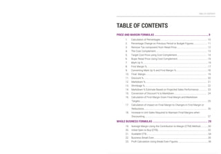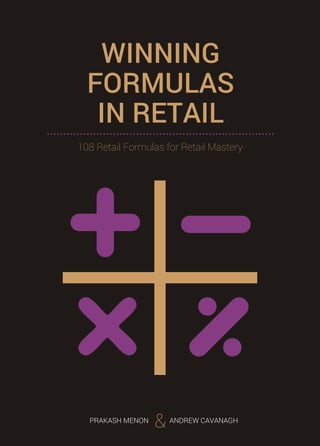 This document contains a table of contents for the book "Winning Formulas in Retail" by Prakash Menon and Andrew Cavanagh. The book contains over 100 retail formulas organized into sections on price and margin formulas, whole business formulas, productivity formulas, financial formulas, supply chain and logistics formulas, and store operations formulas. It also includes brief biographies of the authors, Prakash Menon and Andrew Cavanagh. Menon is a globally renowned retail expert and author of multiple books while Cavanagh's background is not provided. The book provides formulas to help retailers with calculations related to pricing, margins, business performance, productivity, finances, supply chain management, and store operations.
