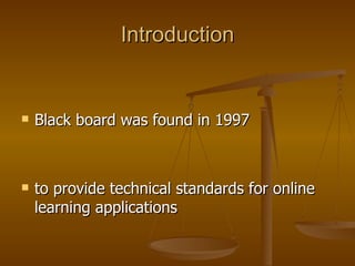 Blackboard was created in 1997 to provide online learning applications. It allows professors to post course materials like syllabi and study guides for easy student access. Students can access materials anytime from anywhere and submit assignments as soon as they are completed. Teachers can track student performance and provide immediate feedback. Blackboard provides two types of feedback - faculty feedback and automated feedback for objective questions. Students can take tests, receive immediate scoring, and see their grades. It also allows chat functions, emailing, and tracking of student usage and assignments.