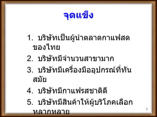 จุดแข็ง 1. บริษัทเป็นผู้นำตลาดกาแฟสดของไทย 2. บริษัทมีจำนวนสาขามาก 3. บริษัทมีเครื่องมืออุปกรณ์ที่ทันสมัย 4. บริษัทมีกาแฟรสชาติดี 5. บริษัทมีสินค้าให้ผู้บริโภคเลือกหลากหลาย 6. บริษัทจัดกิจกรรมทางการตลาดอย่างต่อเนื่อง - 3.