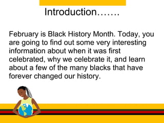 The document is a web quest about Black History Month that directs the reader to various websites to learn about important figures and events in black history. It asks the reader to find information about Carter G. Woodson who established Black History Week, which later became Black History Month. It also has the reader learn about Martin Luther King Jr. who won the Nobel Peace Prize at age 35 for his work with nonviolent civil rights protests and his dream of equality and justice. Additionally, it discusses Jackie Robinson who broke the color barrier in Major League Baseball in 1947 and the Underground Railroad which was started by Harriet Tubman and helped slaves escape to freedom.
