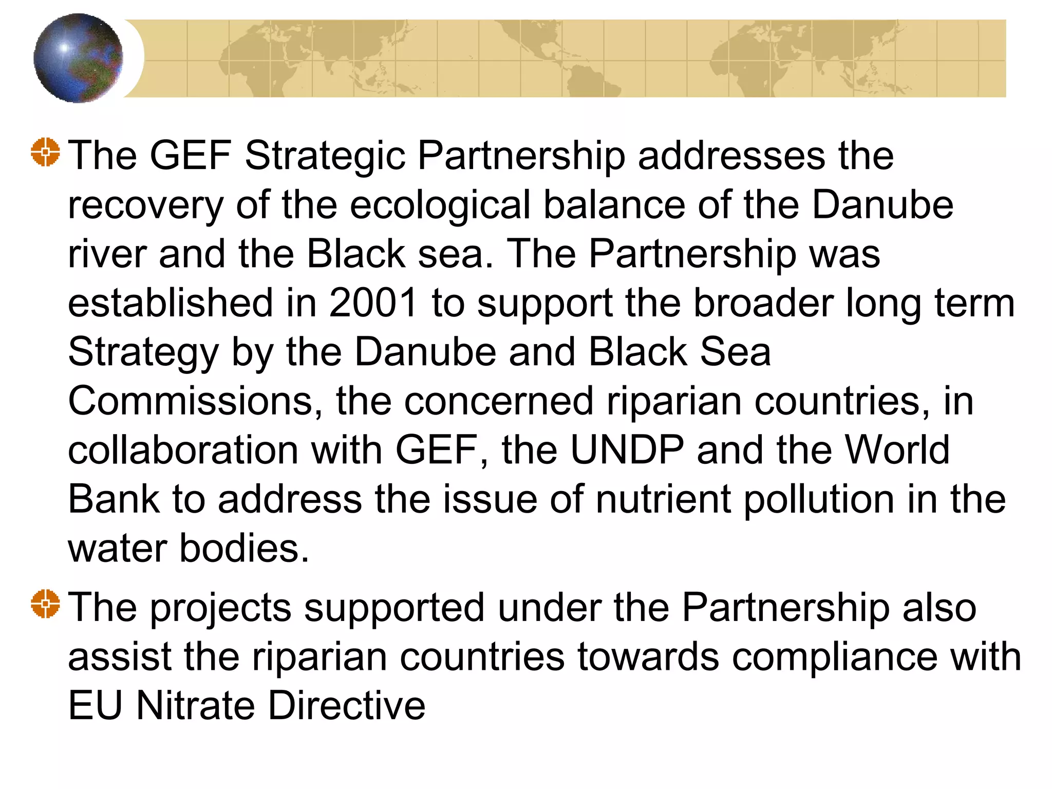 The GEF Strategic Partnership addresses nutrient pollution in the Danube River and Black Sea through projects that restore wetlands, improve agriculture practices, and expand wastewater treatment. The Partnership supports 10 projects across several countries to reduce nutrient runoff in compliance with the EU Nitrate Directive. Projects have made progress improving manure management, expanding use of environmentally-friendly practices, and strengthening water quality monitoring in countries like Moldova, Romania, Bulgaria, and Turkey.