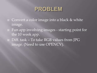 This document discusses converting a color image to black and white by taking the RGB values from a JPG image using OpenCV. It presents the task of creating a fun app that converts color images to black and white as the starting point for a 10 week app development project. OpenCV will be needed to access the RGB values from the color image.