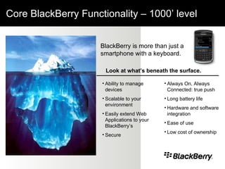 The document discusses BlackBerry's mobile data solutions for businesses, including the BlackBerry Enterprise Server, BlackBerry Professional Software, and BlackBerry Internet Service. It outlines the key features and benefits of BlackBerry's push-based email, security, manageability, and support for third-party applications. Customer concerns around cost are addressed through promotion of discounted pricing on server licenses and devices.