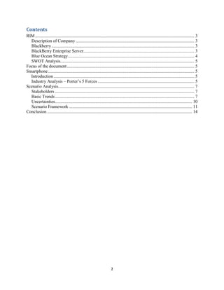The document provides an overview and analysis of Research In Motion (RIM) and their Blackberry smartphones. It describes RIM's history and products, including the Blackberry and Blackberry Enterprise Server. It then performs a SWOT analysis and discusses RIM's original "Blue Ocean Strategy". The focus is stated as using scenario analysis to identify potential threats to Blackberry's dominant position and strategies for RIM to address those threats over the next 3-5 years. An analysis of the smartphone industry and Porter's 5 Forces model is also presented.