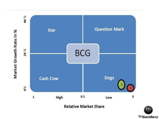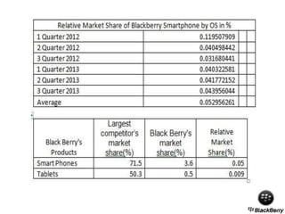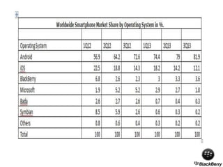 The document presents a comprehensive analysis of Blackberry's turnaround strategy, focusing on the smartphone industry and its various challenges, including competition and market demands. It includes a SWOT analysis highlighting Blackberry's strengths, weaknesses, opportunities, and threats, alongside financial performance metrics and proposed strategies for recovery. The document aims to identify loopholes in Blackberry's strategy and suggest a path to regain its market position by emphasizing security features and targeting emerging markets.