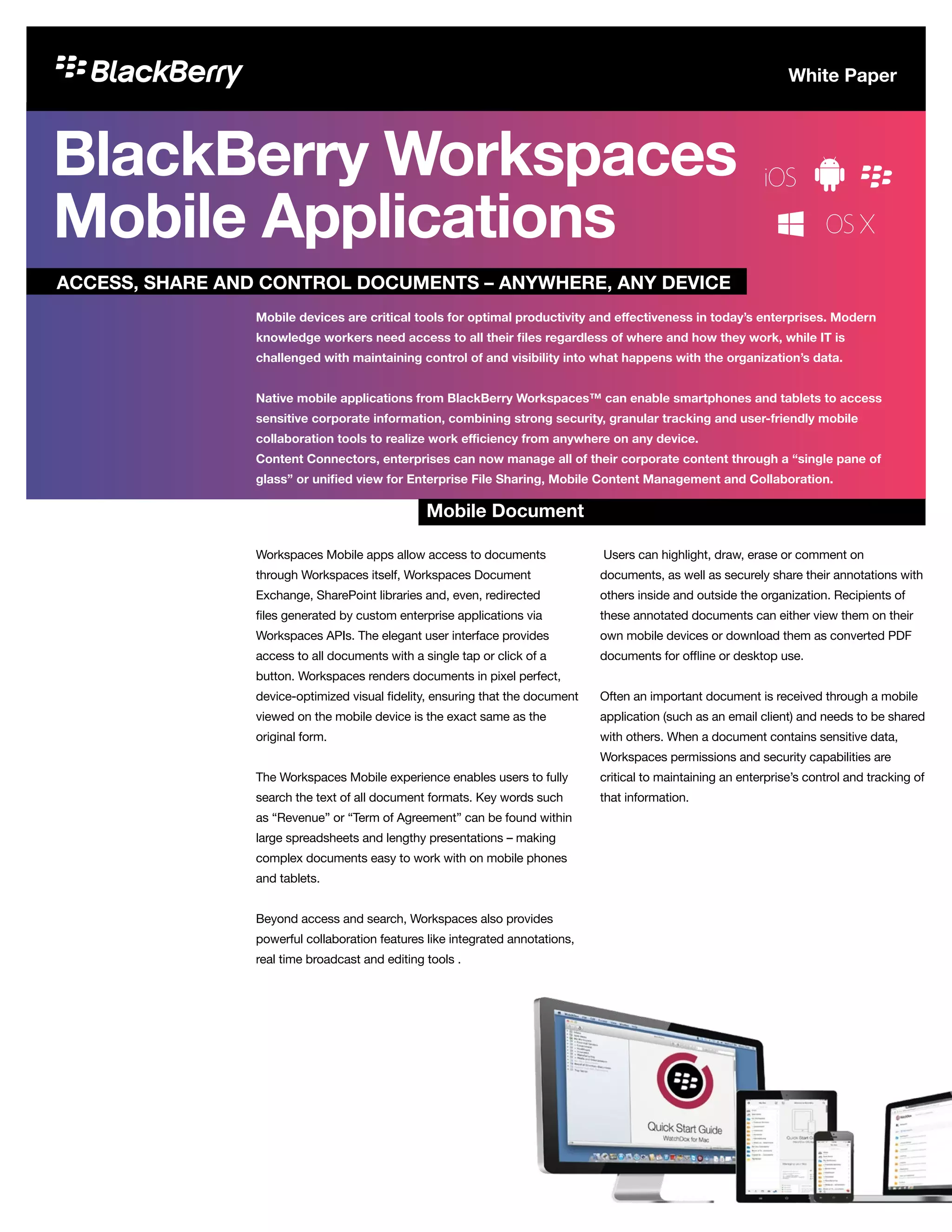 BlackBerry Workspaces mobile applications provide secure access and collaboration on documents across devices, allowing users to search, annotate, and share files efficiently. The platform emphasizes strong security measures, including encryption and document tracking, while also integrating with various tools like Salesforce and Outlook for streamlined workflows. With features tailored for mobile productivity, Workspaces aims to empower enterprises to manage and control sensitive information effectively.