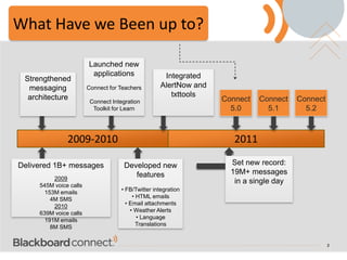 Blackboard Connect 5 is an upgraded messaging system for educational institutions, enhancing communication with features like real-time reporting, improved interfaces, and an iPhone app. The system has shown significant capacity for message delivery, offering tools for better parent engagement and streamlined workflows. Schools using Connect 5 can expect improved efficiency, automated messaging, and support for multiple languages to better serve diverse communities.