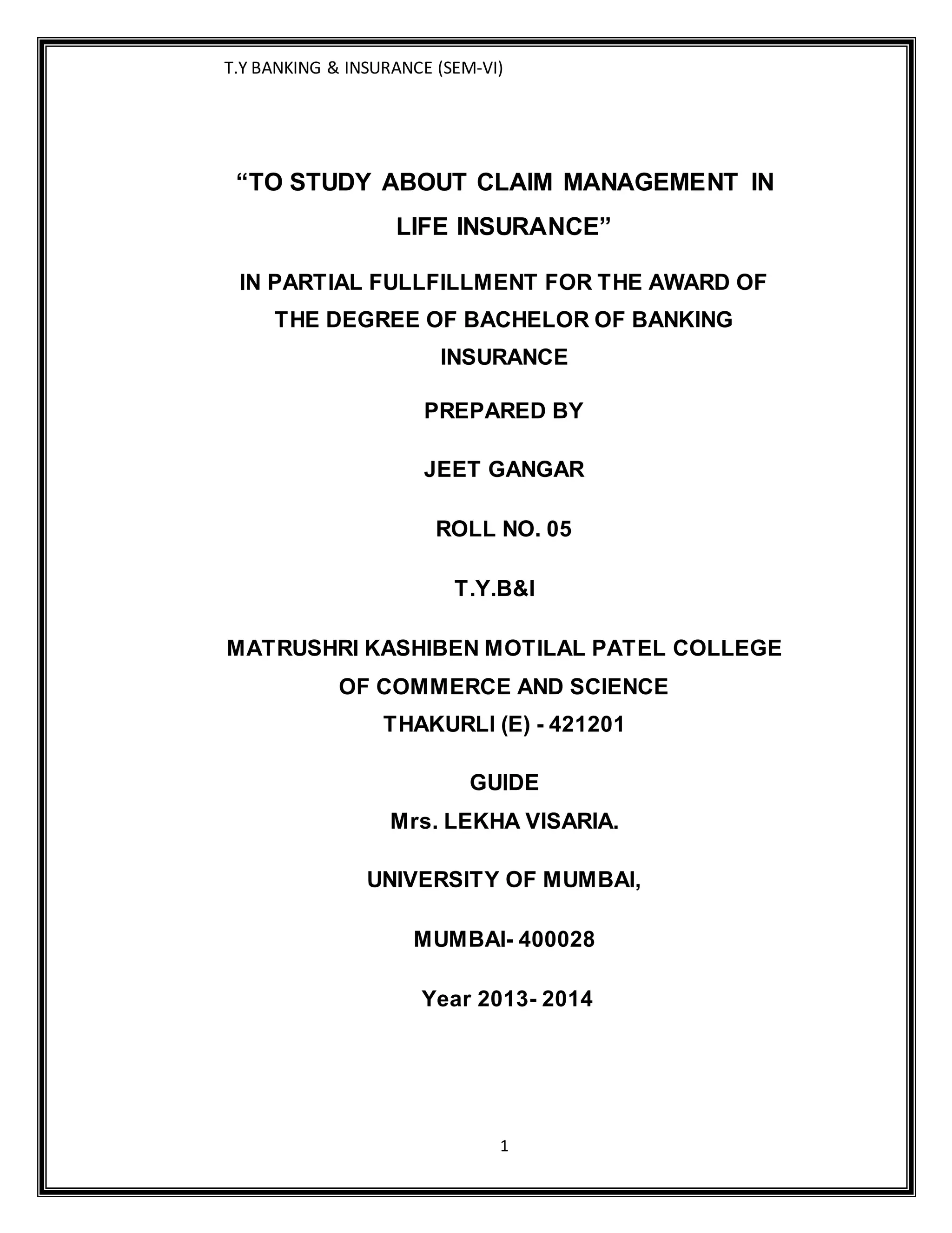 This document is a project report on studying claim management in life insurance. It includes an introduction that provides background on insurance, life insurance, and claim management processes. It then outlines the report structure which includes chapters on introduction, case study, research methodology, data analysis, findings, suggestions, and references. The objectives are to study claim management in life insurance and understand problems with taking out policies and settling claims. It assumes most customers are aware of claim management processes.