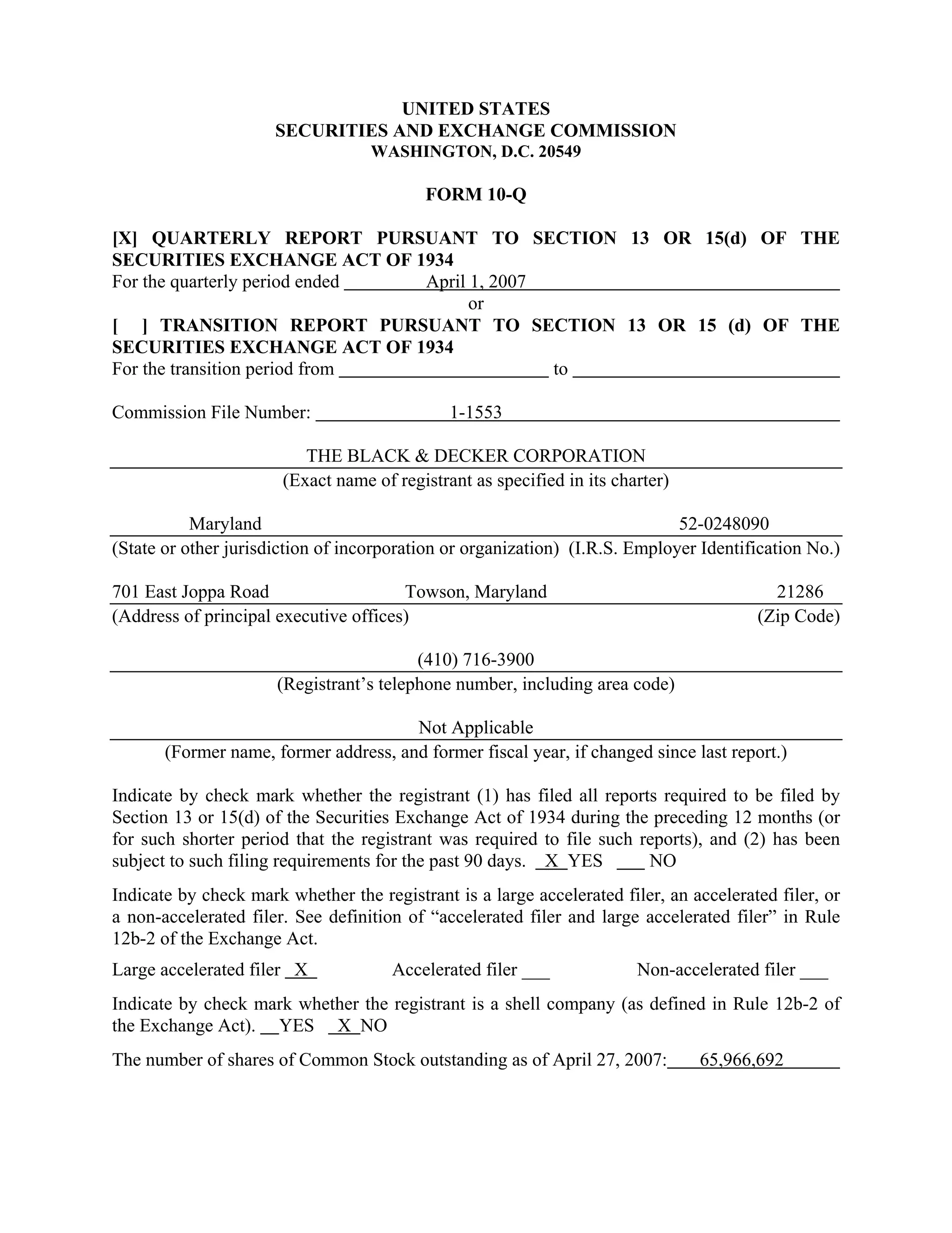 This document is a quarterly report filed by The Black & Decker Corporation with the United States Securities and Exchange Commission for the quarter ending April 1, 2007. It includes financial statements such as the consolidated statement of earnings, balance sheet, and cash flows. The report provides key financial information about Black & Decker's performance for the quarter, including sales, costs, expenses, earnings, assets, liabilities, and cash flows. It also includes notes to the financial statements regarding accounting policies and the adoption of a new accounting standard related to uncertainty in income taxes.