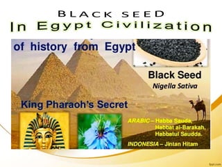 Black seed, also known as nigella sativa, has many potential health benefits supported by research studies. It may help treat type 2 diabetes, epilepsy, colon cancer, MRSA, heart attacks, breast cancer, brain cancer, leukemia, brain damage from lead, and oral cancer. The seed contains phytochemicals like thymoquinone that are anti-fungal, anti-cancer, beneficial for liver health, may help with weight loss and diabetes, and can treat infections like MRSA. Black seed oil may also benefit hair, skin, and insomnia when used consistently over time.
