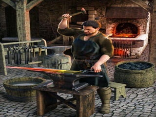 Henry Wadsworth Longfellow (1807-1882) was an American poet best known for works such as Paul Revere's Ride, The Song of Hiawatha, and Evangeline. He was also the first American to translate Dante's Divine Comedy. The poem describes a blacksmith standing under a chestnut tree in a village, using muscular and strong terms to portray him. It depicts the blacksmith's daily work from morning until night and suggests he is self-sufficient through his work.