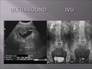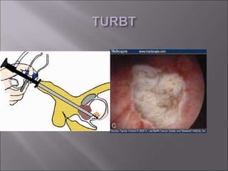 This document discusses transitional cell carcinoma of the bladder. It notes that 90% of bladder cancers are transitional cell carcinoma, while 5% are squamous cell carcinoma and 1% are adenocarcinoma. It covers causes, staging according to the TNM system, types of bladder tumors, behavior, symptoms, investigations, and treatments which include transurethral resection of the bladder tumor (TURBT) for non-muscle invasive tumors and radical cystectomy for muscle-invasive tumors. Recurrence rates are higher for carcinoma in situ, high grade tumors, and those with a high chance of recurrence, so intravesical BCG may be used after TURBT for these cases.
