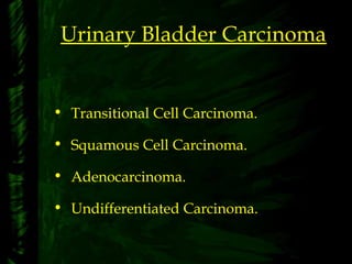The document discusses tumors of the urinary bladder, including transitional cell carcinoma, squamous cell carcinoma, adenocarcinoma, and undifferentiated carcinoma. It describes the clinical presentation, spread, and imaging findings of urinary bladder carcinoma. Imaging modalities like plain X-ray, IVU, ultrasound, CT, and MRI are discussed for evaluating urinary bladder masses, wall thickening, calcifications, fistulas, and metastasis.