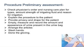 This document provides information about bladder irrigation, which is a procedure to flush the inside of the bladder. It involves washing out the bladder with saline to remove excess mucus and keep the catheter from becoming plugged. This helps urine drain freely and prevents infections and stones. The document discusses preparing the patient, family, and unit for the procedure. It explains cleaning supplies, using sterile water, inserting a catheter to drain urine, flushing the bladder with 50-60cc of water, draining the water, and washing hands and supplies after.