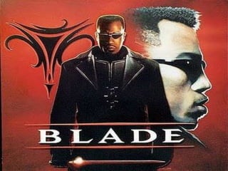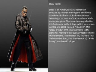 Blade (1998) is an action/fantasy/horror film directed by Stephen Norrington about a half-mortal, half-vampire man named Blade who protects humans by slaying vampires. There were two sequels, Blade II (2002) directed by Guillermo del Toro and Blade Trinity (2004) directed by David S. Goyer, which improved on the storyline. The character Blade is portrayed as wearing glasses to hide his vampire identity and uses weapons and gadgets to battle enemies despite his supernatural abilities.