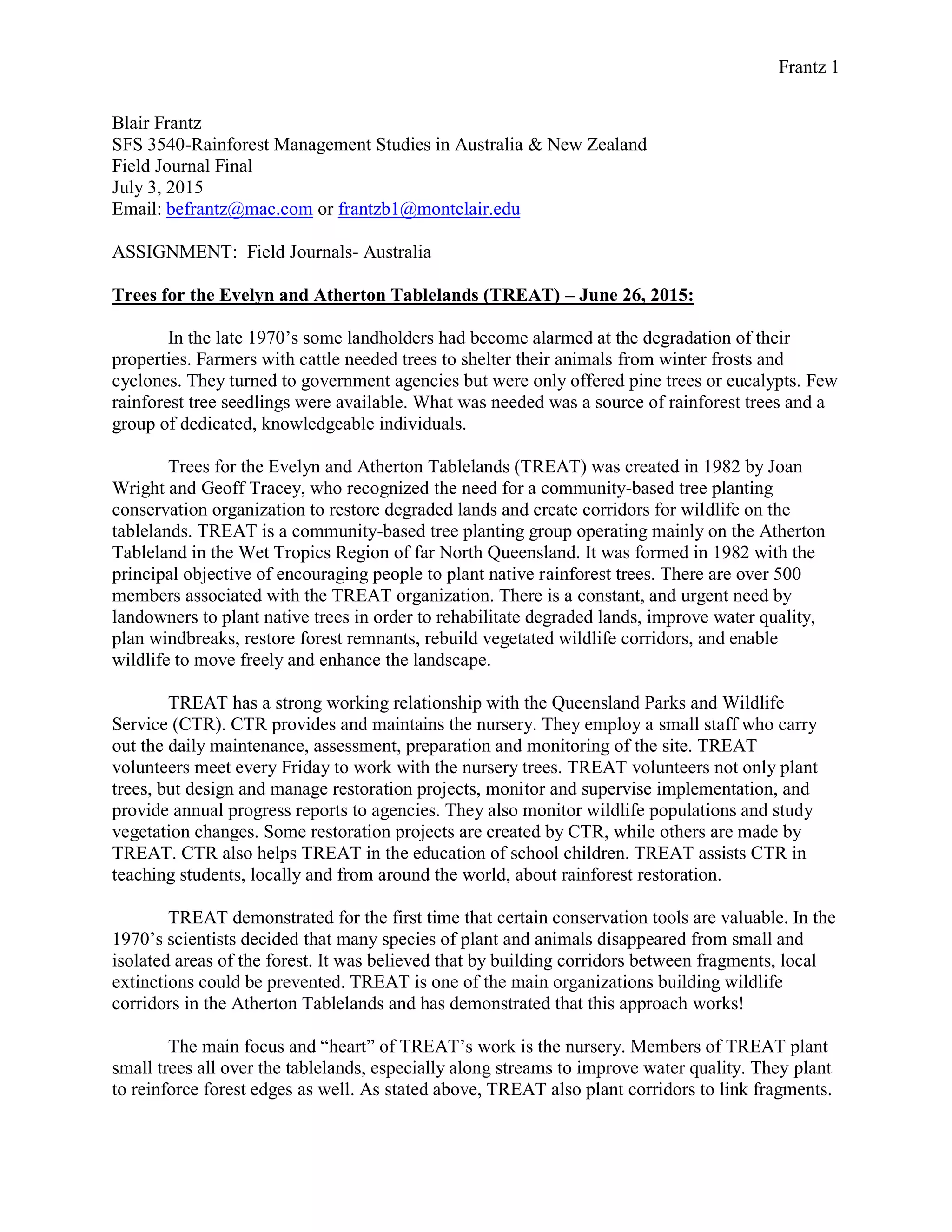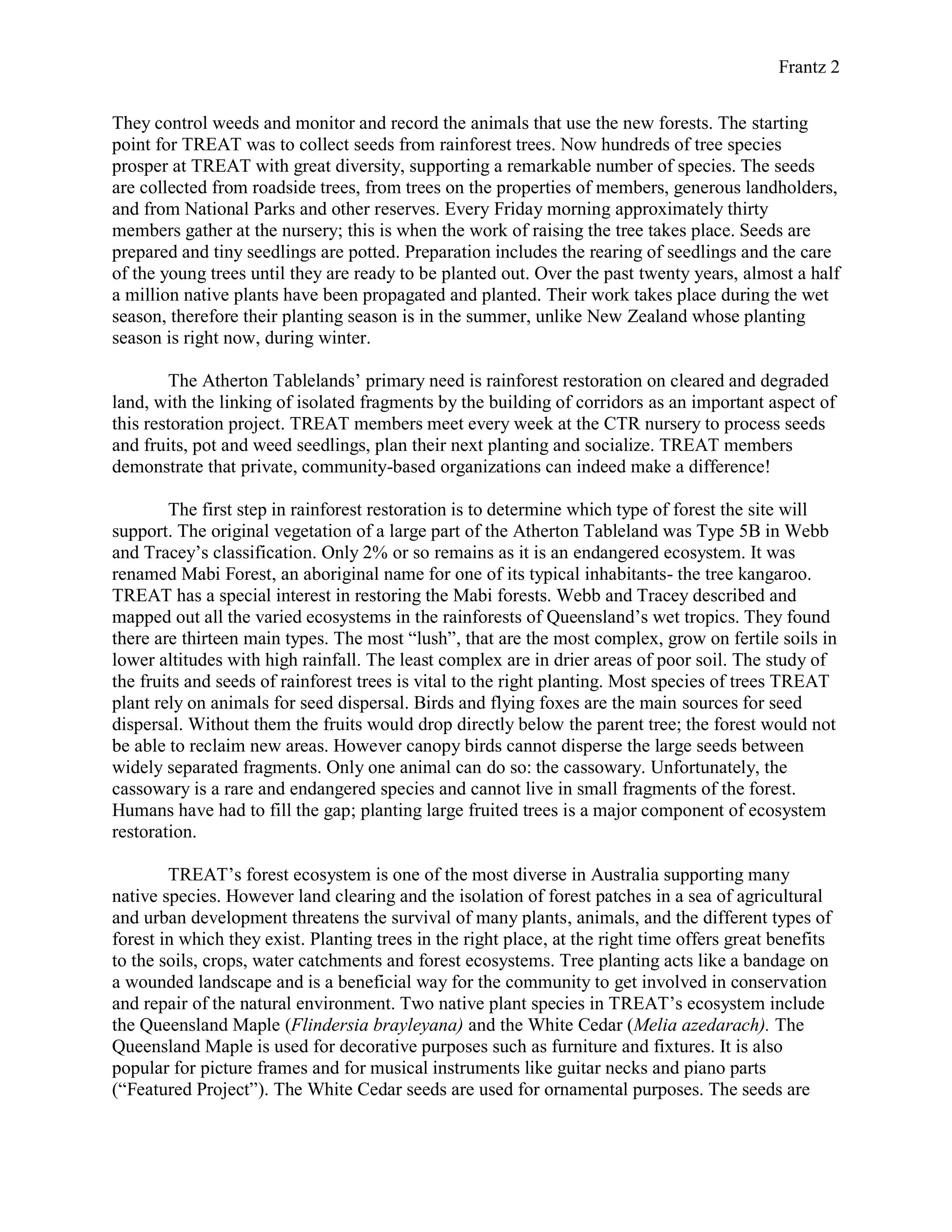 The document summarizes the work of Trees for the Evelyn and Atherton Tablelands (TREAT), a community-based tree planting group in Queensland, Australia. TREAT was founded in 1982 to encourage planting of native rainforest trees and has since planted over 500,000 trees. Their work focuses on restoring degraded lands and creating wildlife corridors. The document also describes Peterson Creek, where TREAT has worked since 1998 to establish a corridor connecting two isolated forest patches by planting over 89,000 trees along the creek.