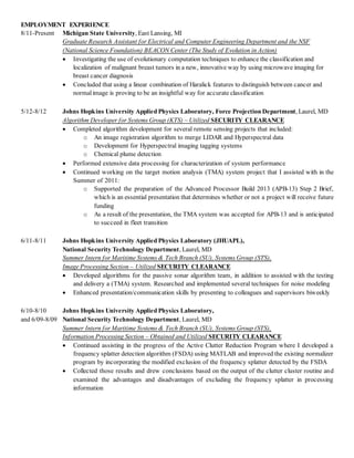 Blair D. Fleet is a 5th year PhD student in Electrical Engineering at Michigan State University, specializing in signal processing and evolutionary computation. He has a MS in Electrical Engineering from MSU and a BS in Electrical Engineering from Morgan State University. His research focuses on using evolutionary computation techniques to enhance breast cancer detection through microwave imaging. He has extensive volunteer experience mentoring students in robotics and engineering. He has also worked as a research assistant and intern at Johns Hopkins Applied Physics Laboratory and Michigan State University on projects involving signal processing, image analysis, and algorithm development.
