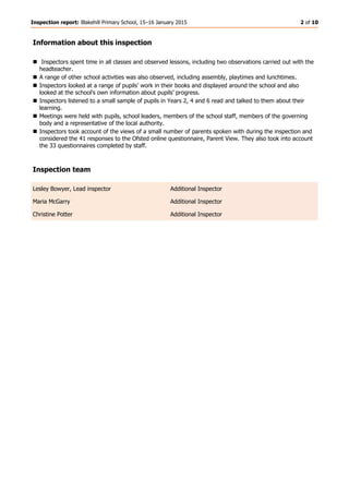 This school inspection report finds that Blakehill Primary School is a good school. It summarizes that the school is led well and pupils behave well and feel safe. The quality of teaching is also good, resulting in pupils achieving good outcomes. The report provides some areas for further improvement, such as ensuring work is always sufficiently challenging, especially for the most able pupils.