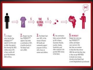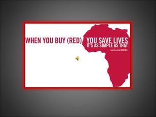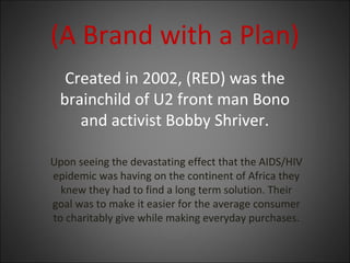 (RED) is a brand established by Bono and Bobby Shriver in 2002 to combat the HIV/AIDS epidemic in Africa by enabling consumers to contribute to charitable causes through everyday purchases. Partner brands pay a fee to use the (RED) brand and donate a percentage of sales to the Global Fund, which provides essential treatment for HIV, AIDS, tuberculosis, and malaria. Since its inception, (RED) has generated over $150 million, reaching more than 5 million people with crucial medical services.