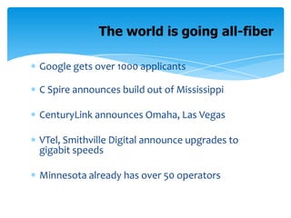 This document discusses the growth of fiber optic networks, particularly in rural areas of the United States. It provides statistics showing increasing numbers of homes that have fiber connectivity and outlines some of the drivers of this growth, including stimulus funding and existing providers upgrading to gigabit speeds. The benefits of fiber networks for economic development and access to services in rural communities are highlighted. Different fiber network architectures like PON and point-to-point are described, and challenges rural communities face in making the business case for a fiber network are discussed. Resources for communities to assist in planning and funding fiber deployments are provided.
