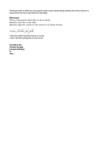 The document compares and contrasts the book and film versions of Holes. It notes that in the book, Stanley Yelnats is sent to a camp where he has to dig holes five feet deep, while in the film he digs for water. Some character differences are mentioned, such as Stanley not being fat in the film. The writer expresses liking the yellow spotted lizard in the movie, but disliking Mr. Pendanski, and liking Zigzag but disliking Mr. Sir in the book.