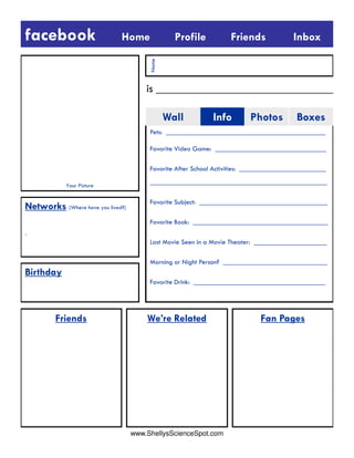 This document appears to be a profile page for a social media site, likely for a child. It requests basic information such as name, picture, birthday, pets, favorite activities, subjects, books and movies. It also asks if the person is a morning or night person and their favorite drink. The profile page is connected to friends, family members, and fan pages of interests.