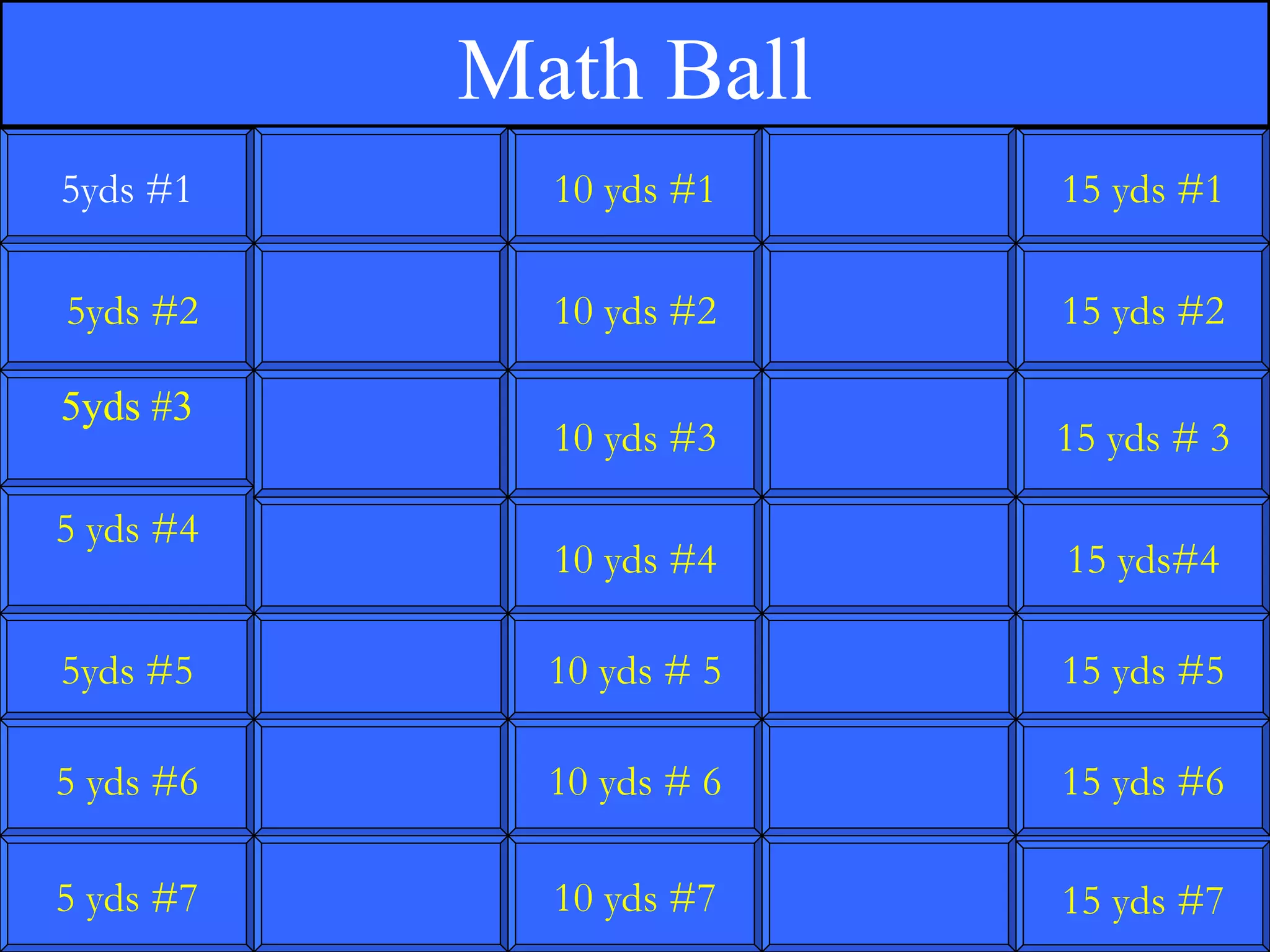 The document lists a series of questions and answers categorized by yardage increments, specifically 5, 10, and 15 yards. Each category includes multiple items with corresponding question and answer pairs, indicating different points. The structure suggests a quiz or assessment format focused on measuring yards.