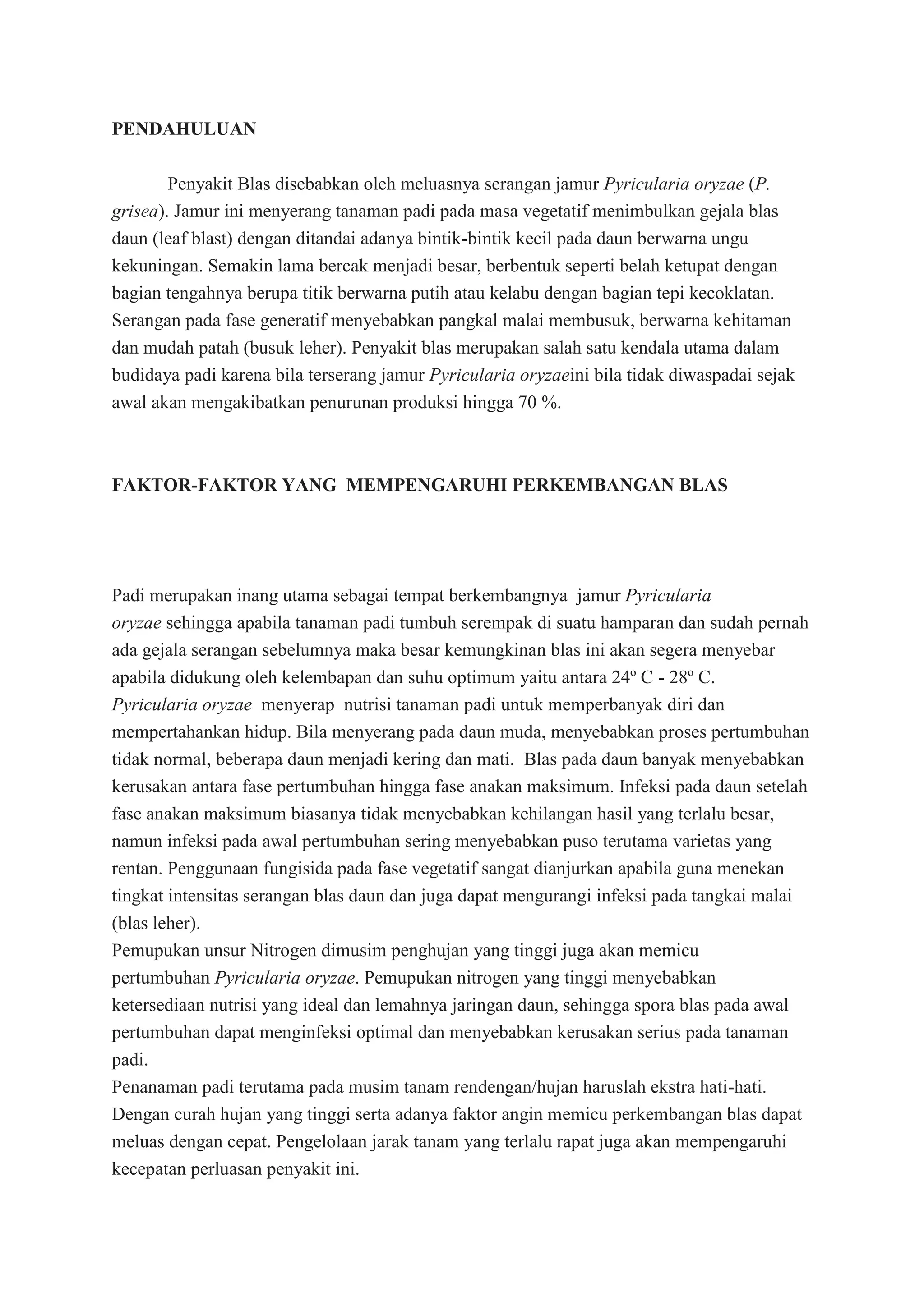Penyakit blas pada padi disebabkan oleh jamur Pyricularia oryzae, yang dapat menurunkan hasil panen hingga 70% jika tidak dikendalikan. Pencegahan dapat dilakukan melalui pengelolaan tanaman terpadu, penggunaan varietas tahan, pemupukan seimbang, dan aplikasi fungisida kimia serta nabati. Upaya pencegahan harus dilakukan sejak awal budidaya, terutama di daerah yang endemi penyakit ini.