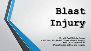 Blast injuries are physical trauma resulting from exposure to explosions. They are increasing worldwide from civilian and terrorist explosions. Blast injuries can be categorized as primary, secondary, tertiary, and quaternary injuries. Primary injuries directly result from blast overpressure and include injuries to lungs, ears, and hollow abdominal organs. Secondary injuries are caused by bomb fragments accelerating into the body. Tertiary injuries are from being thrown by the blast wind, and quaternary injuries include burns and psychological trauma. Management involves treating life-threatening injuries first according to ATLS protocol, thoroughly cleaning wounds, and using imaging tools like CT scans to aid diagnosis and guide further treatment.
