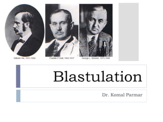 Blastulation refers to the process in early embryonic development where the zygote undergoes rapid cell divisions through cleavage to form a solid ball of cells called a morula. The morula then develops a fluid-filled cavity, forming a structure called a blastocyst composed of an inner cell mass and outer layer of trophoblast cells. The blastocyst undergoes further differentiation, with the inner cell mass forming the embryo and extraembryonic tissues such as the amnion, yolk sac, and allantois developing to support the growth and development of the embryo.