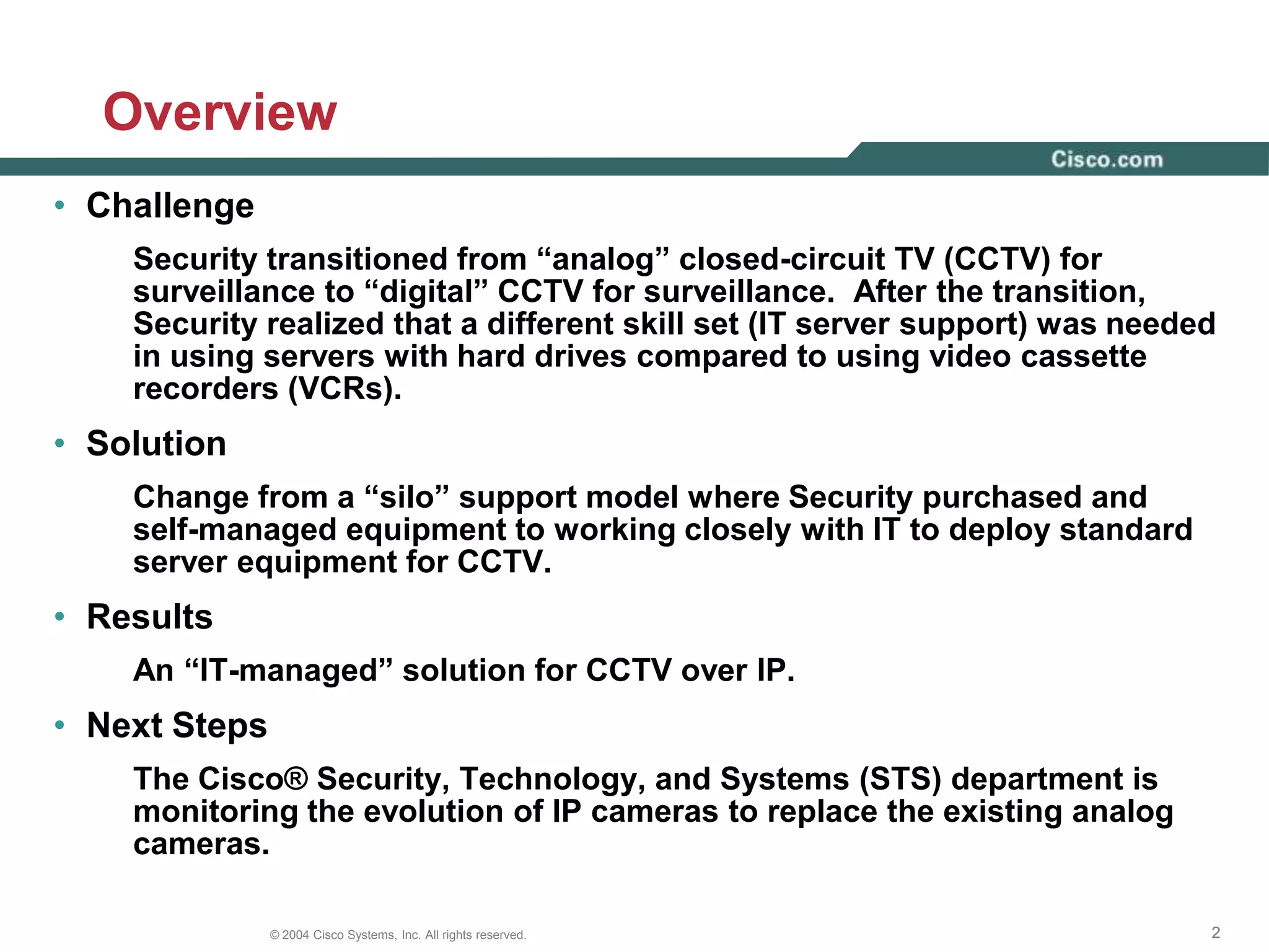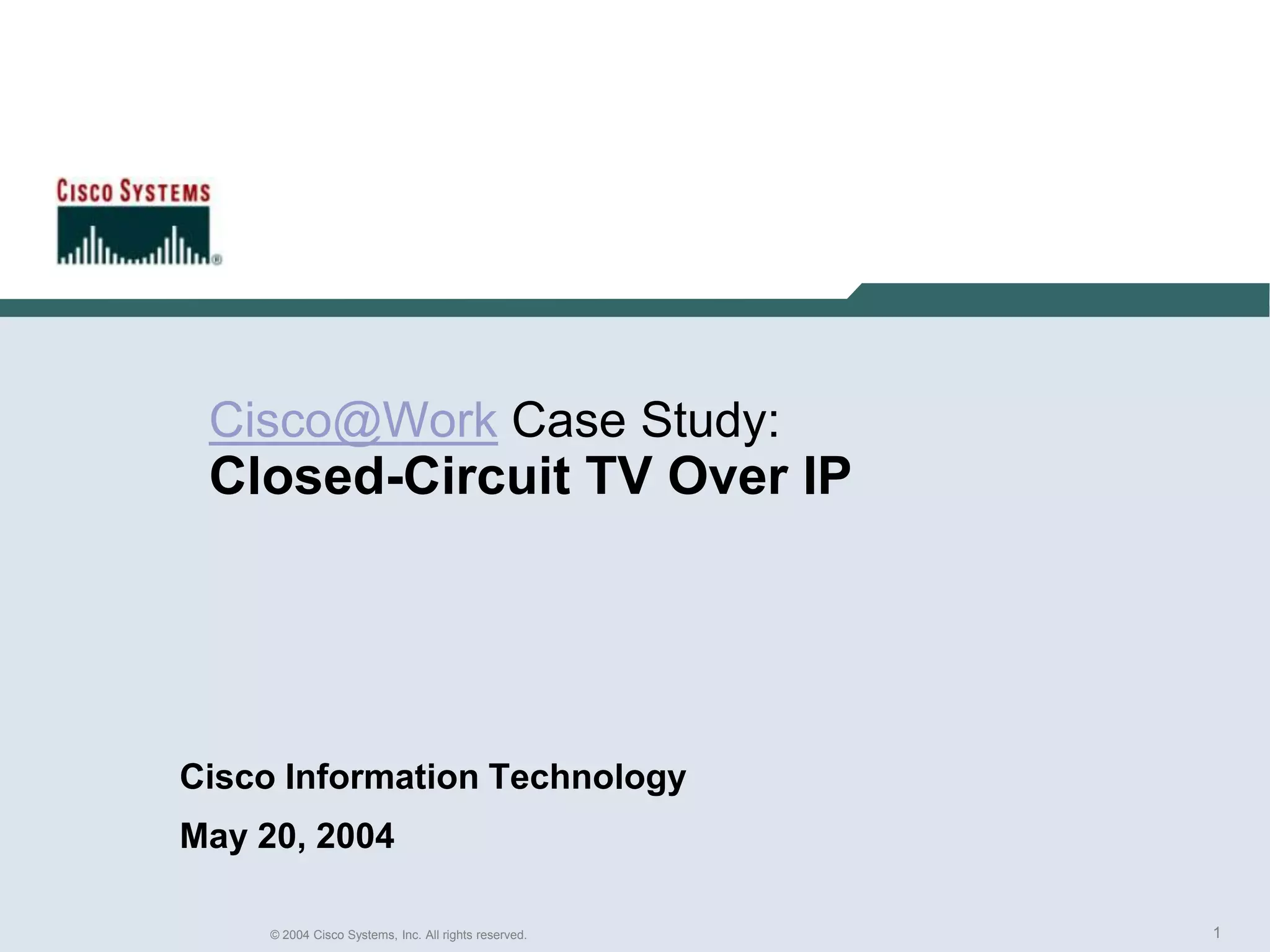 The document summarizes Cisco's transition from an analog CCTV surveillance system using VCRs to a digital IP-based CCTV system managed by IT. The analog system was labor intensive and prone to errors. Cisco transitioned to using DVR servers but then faced challenges of managing over 330 servers. Cisco collaborated with IT to create a network-centric CCTV over IP solution using IP cameras and network video recorders, resulting in lower costs, improved quality, and other benefits. Cisco is further advancing this system by replacing analog with IP cameras and exploring video analysis technologies.