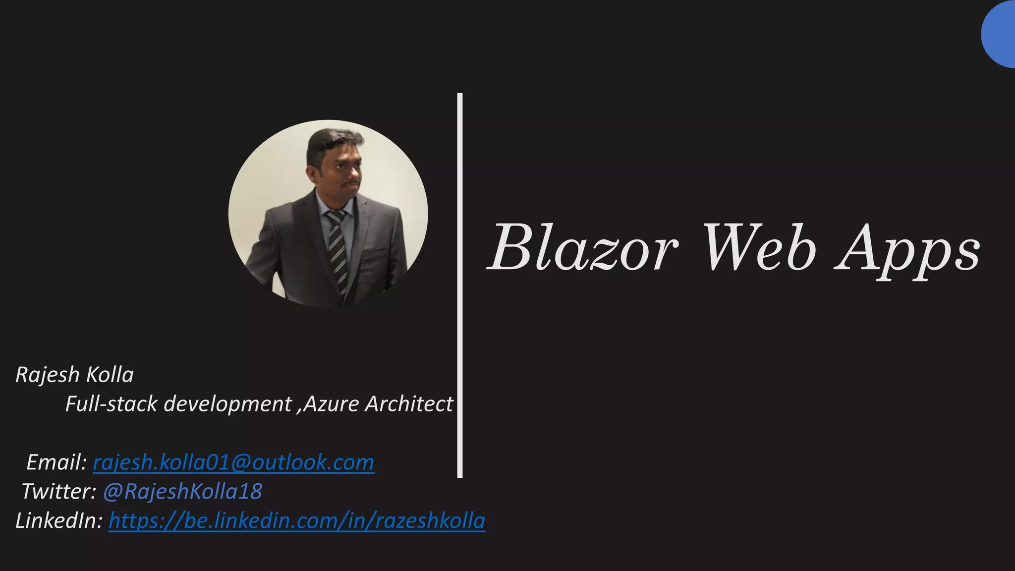 The document provides an overview of Blazor, an open-source framework for building interactive web applications using C# instead of JavaScript. It highlights Blazor's hosting models, components, dependency injection, and JavaScript interoperability, alongside its history and evolution. The presentation concludes with demos and a Q&A session, emphasizing the advantages of Blazor for full-stack development.