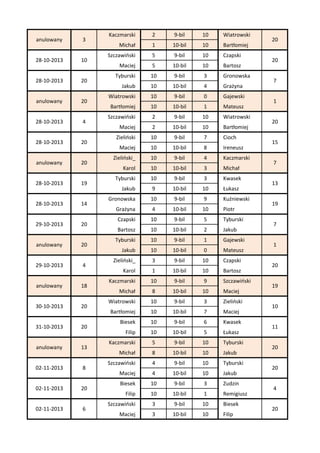 18-11-2013 7 19-11-2013 14 19-11-2013 12 anulowany 10 anulowany 3 anulowany 19 25-11-2013 20 25-11-2013 20 26-11-2013 8 anulowany 9 27-11-2013 17 27-11-2013 20 anulowany 10 ? 20 02-12-2013 4 09-12-2013 15 ? 6 14-12-2013 7 14-12-2013 10 Zieliński_ 2 9-bil 10 Kuźniewski Karol 5 10-bil 10 Piotr Zudzin 10 9-bil 4 Szczawiński Remigiusz 4 10-bil 10 Maciej Gronowska 4 9-bil 10 Biesek Grażyna 8 10-bil 10 Filip Kuźniewski 9-bil Kaczmarski Piotr 10 10-bil 6 Michał Kaczmarski 2 9-bil 10 Czapski Michał 1 10-bil 10 Bartosz Łukasz 10 9-bil 5 Kaczmarski Kwasek 9 10-bil 10 Michał Czapski 10 9-bil 5 Kuźniewski Bartosz 10 10-bil 2 Piotr Gronowska 10 9-bil 6 Zieliński_ Grażyna 10 10-bil 6 Karol Kuźniewski 2 9-bil 10 Zieliński Piotr 6 10-bil 10 Maciej Gajewski 5 9-bil 10 Cioch Mateusz 4 10-bil 10 Ireneusz Zudzin 7 9-bil 10 Zieliński_ Remigiusz 10 10-bil 8 Karol Zieliński 10 9-bil 2 Zudzin Maciej 10 10-bil 7 Remigiusz Gajewski 2 9-bil 10 Szczawiński Mateusz 8 10-bil 10 Maciej Gronowska 10 9-bil 7 Zudzin Grażyna 10 10-bil 6 Remigiusz Zudzin 2 9-bil 10 Kuźniewski Remigiusz 2 10-bil 10 Piotr Kuźniewski 10 9-bil 9 Biesek Piotr 5 10-bil 10 Filip Zieliński_ 2 9-bil 10 Zieliński Karol 4 10-bil 10 Maciej Szczawiński 4 9-bil 10 Suszczyński Maciej 3 10-bil 10 Kamil Suszczyński 4 9-bil 10 Luliński Kamil 6 10-bil 10 Igor 20 14 20 6 20 15 7 12 20 20 18 9 20 13 20 19 20 20 20