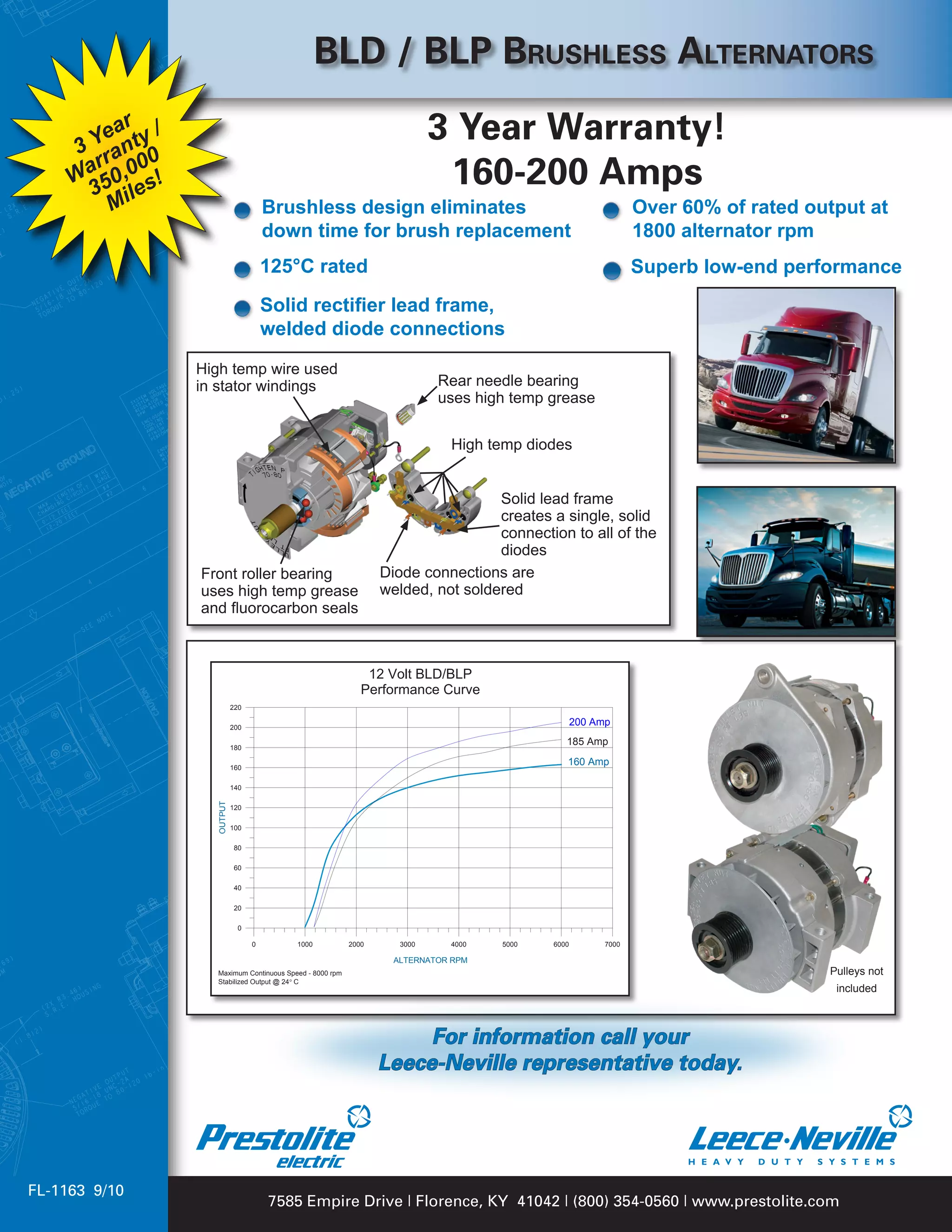 The document details specifications for bld/blp brushless alternators, highlighting their 3-year warranty and performance characteristics, including a capacity range of 160-200 amps. It mentions key features like a brushless design that reduces downtime, high-temperature components, and robust construction for durability. For further information, it provides contact details for Leece-Neville representatives.