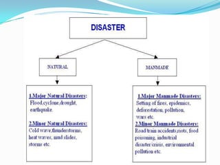 Disaster management involves preparing for, responding to, and recovering from both natural and man-made disasters to minimize their effects. It includes disaster mitigation measures to reduce risk, preparedness planning and training, emergency response during and immediately after a disaster, and recovery efforts to rebuild infrastructure and restore communities. The key principles are using existing day-to-day resources, focusing on large-scale events, making individuals responsible for their own safety, and involving non-government agencies. India is vulnerable to various types of disasters due to factors like its climate and geography.