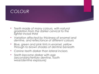 This document discusses tooth colour and bleaching techniques. It begins by describing the natural colours of teeth and factors that affect tooth colour. It then discusses intrinsic and extrinsic tooth discolouration, their causes, and management options. Bleaching techniques are summarized, including home bleaching using trays, in-office bleaching, and non-vital bleaching. Risks and management of sensitivity are also covered. Lasers can be used to enhance bleaching but have higher costs and potential sensitivity risks.