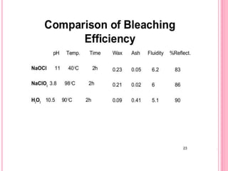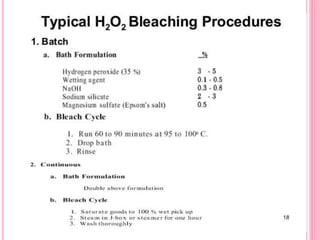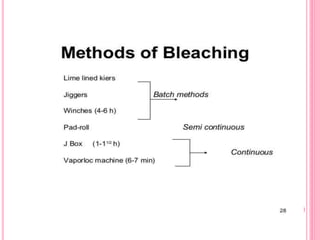This document provides information on the bleaching process. It defines bleaching as the process of decolorizing natural pigments in fabric to produce a white color. The mechanism of bleaching involves breaking double bonds in color-producing organic compounds using oxidizing or reducing agents. Common bleaching agents discussed are sodium hypochlorite, hydrogen peroxide, and sodium chlorite. The effects of factors like pH, time, temperature, and metal ions on bleaching effectiveness are also explained.