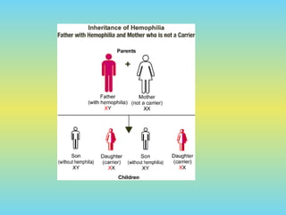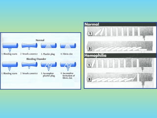 3) These disorders are diagnosed through tests of bleeding time and clotting factor levels and activity. Treatment involves replacing the missing clotting factor through products like cryoprecipitate, desmopressin, or clotting factor concentrates.