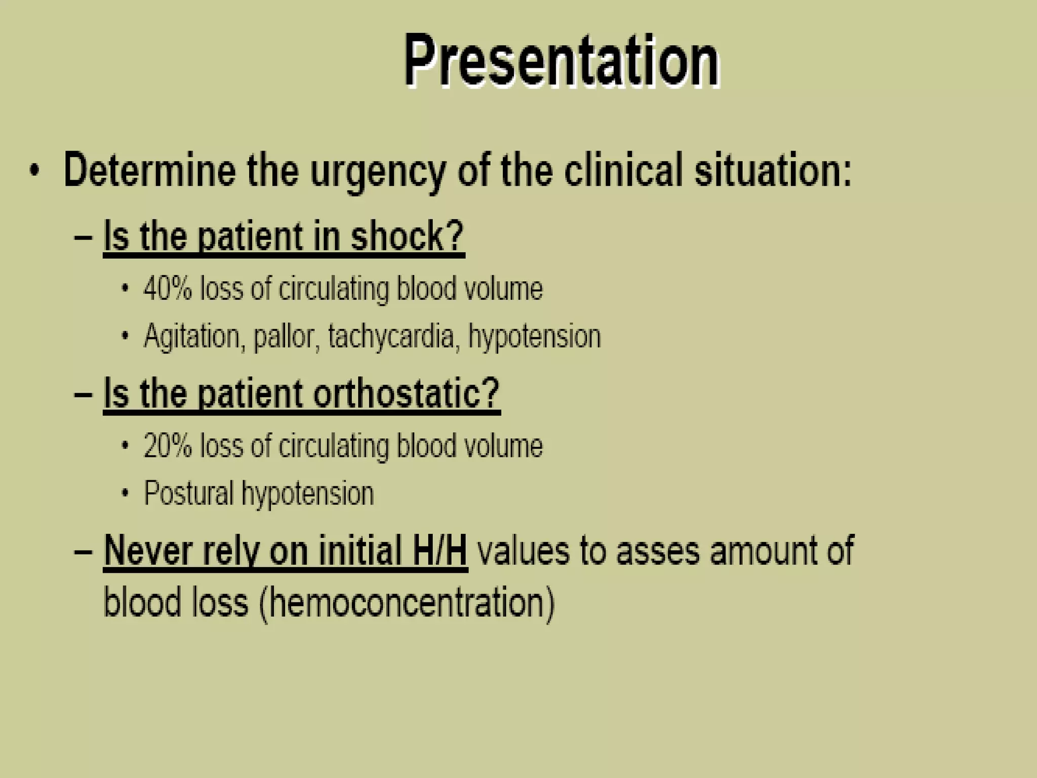 - Clinical presentations of GI bleeding include hematemesis, melena, hematochezia, occult bleeding, and symptoms of blood loss/anemia.