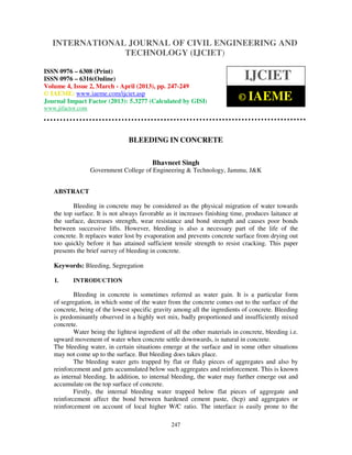Bleeding in concrete refers to the physical migration of water to the top surface due to its lower density. While bleeding replaces water lost to evaporation and prevents cracking, it can also increase finishing time and reduce strength if not properly controlled. The document discusses the causes of bleeding including high water content and improper mixing. It also presents methods to reduce bleeding such as using pozzolans or air-entrainment and ensuring proper proportioning, mixing and compaction. Bleeding is tested using ASTM C 232, which involves measuring water released both with and without vibration.