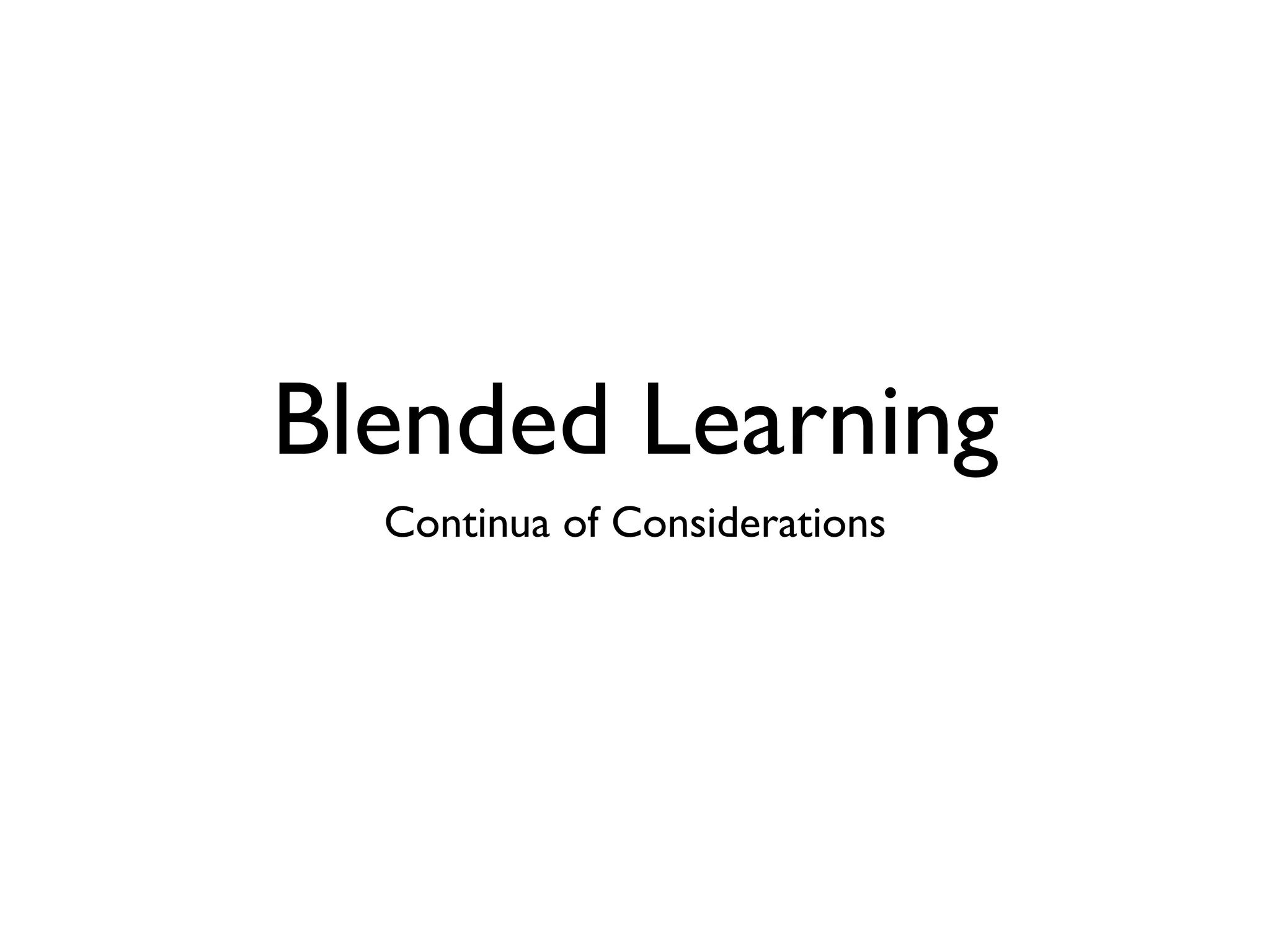 The document discusses various continua of considerations for blended learning, including: the balance between sail ships and steam ships in 1851 America; the relationship between teacher and student motivation and roles; whether learning takes place in school vs other places or alone vs socially; the teacher's role in content and responsibilities for students; characteristics of online course content like authority, curriculum match, skill development, engagement, assessment, and portability; and the technology used like desktop vs pocket-sized devices.
