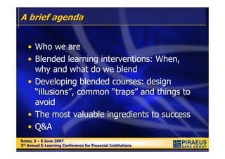 This document discusses blended learning approaches at Piraeus Bank. It provides an overview of Piraeus Bank, including its growth and strategic targets. It then discusses the bank's use of blended learning, when it is applied, and how courses are developed. Key points include blending classroom and online learning to reinforce concepts, ensuring the instructor is involved in course design, and not blending just for the sake of it. The document concludes with a case study on a successful blended learning initiative to sell a complex financial product.
