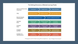 Blended learning combines traditional in-person classroom methods with online and digital learning. It allows incorporating different teaching methods and technologies to optimize learning. Blended learning mixes self-paced online learning with live virtual or in-person classroom sessions, allowing a gradual transition from traditional to online. When used for architecture education, blended learning transforms the design studio into a collaborative online and in-person space where students work on project-based learning and receive feedback from peers and instructors in various formats.