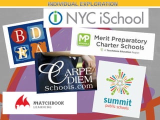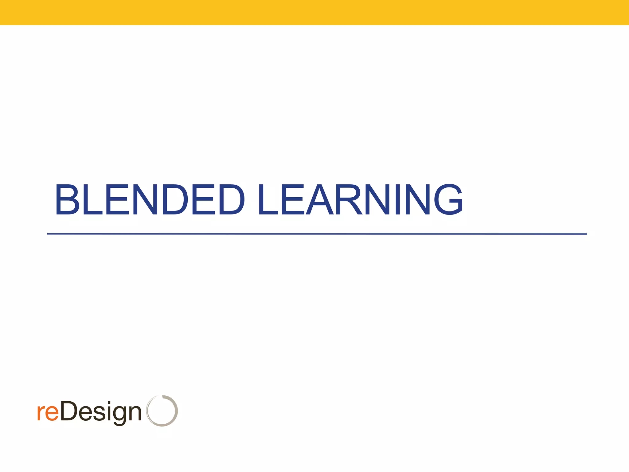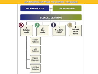 The document discusses blended learning, a teaching approach that combines face-to-face and online experiences, allowing students flexibility in their learning paths. It highlights various blended learning models, including personalized playlists, math rotations, and online collaborative courses, emphasizing the integration of technology to support individualized education. The document also includes resources for further exploration of blended learning practices and case studies from various schools.